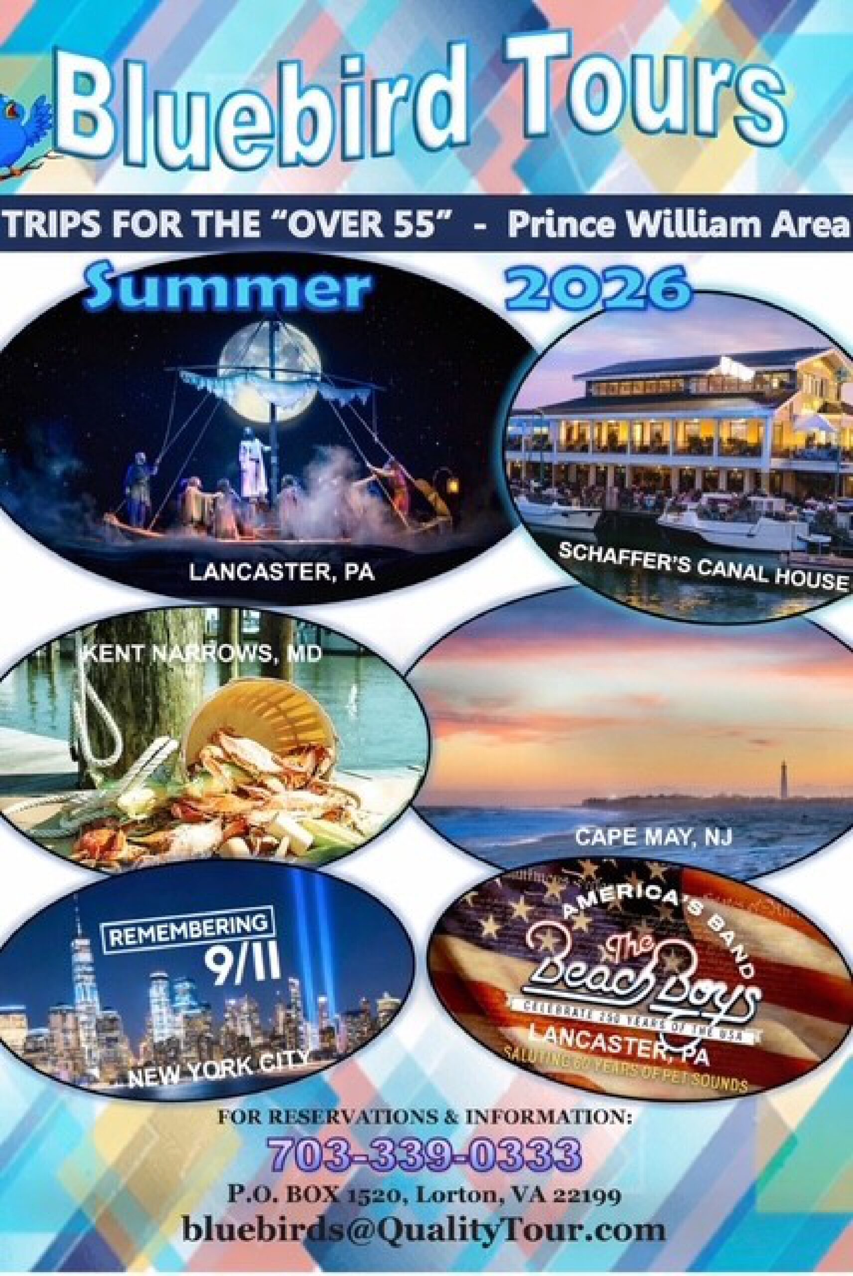If you pay by cash, you must present the exact amount. Payment can also be made by credit card. Trip money will be accepted as soon as the reservation has been confirmed. Please refer to the Bluebird Tour Program Policy Manual for full details of the policies governing the Bluebird Program. You may pick up a copy at the Manassas or Woodbridge Senior Center, the Central Office of the Agency on Aging.